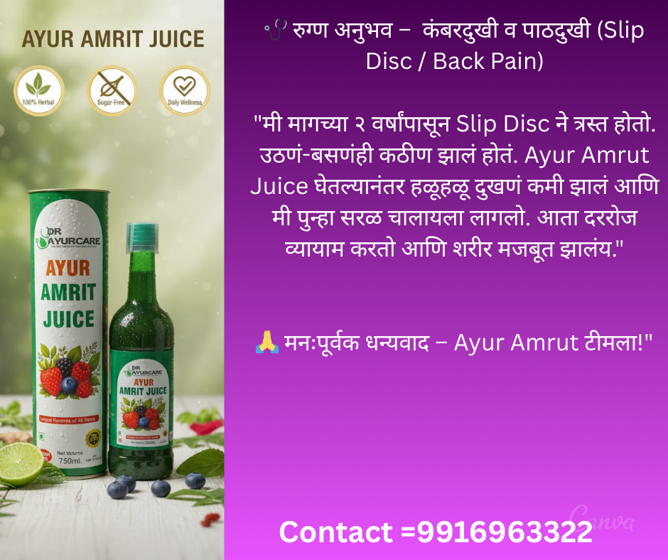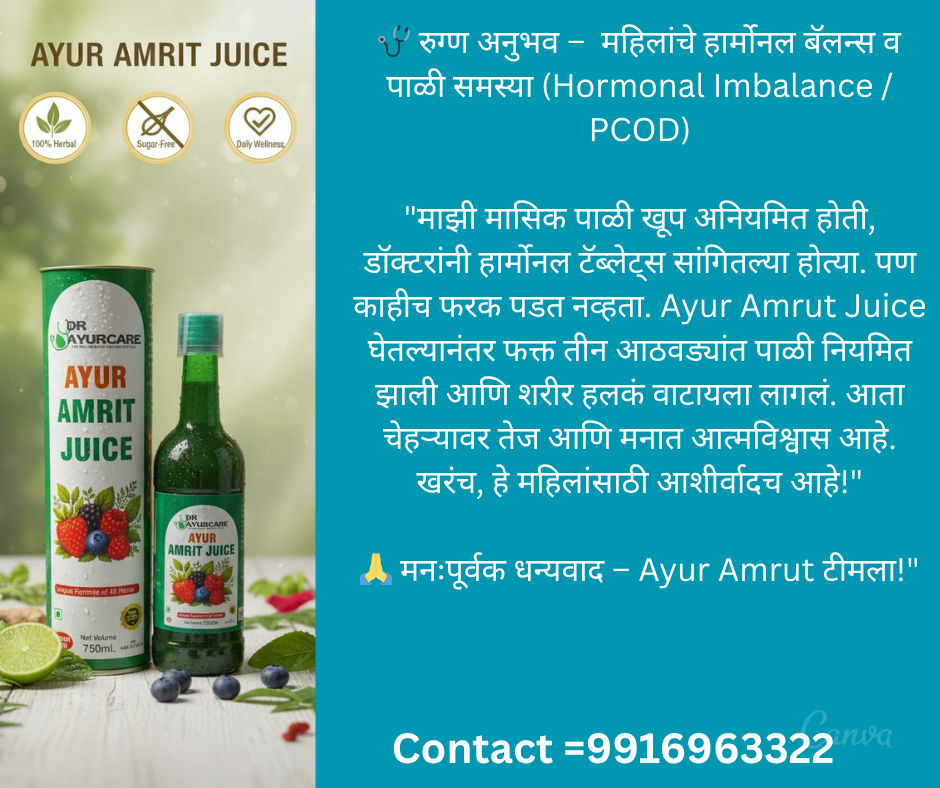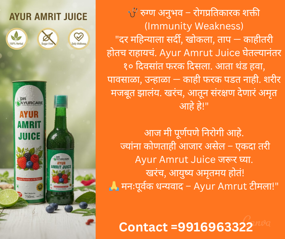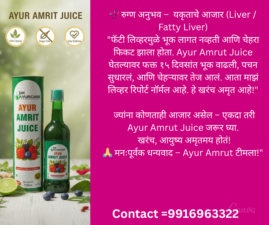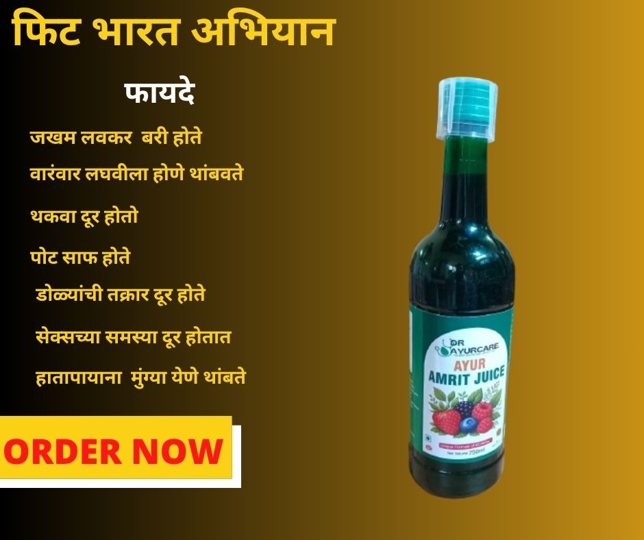 👉 Ayur Amrit Juice हा 45+ आयुर्वेदिक वनस्पती आणि फळांचा बनलेला All-in-One नैसर्गिक आरोग्य पेय आहे.