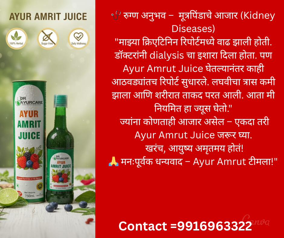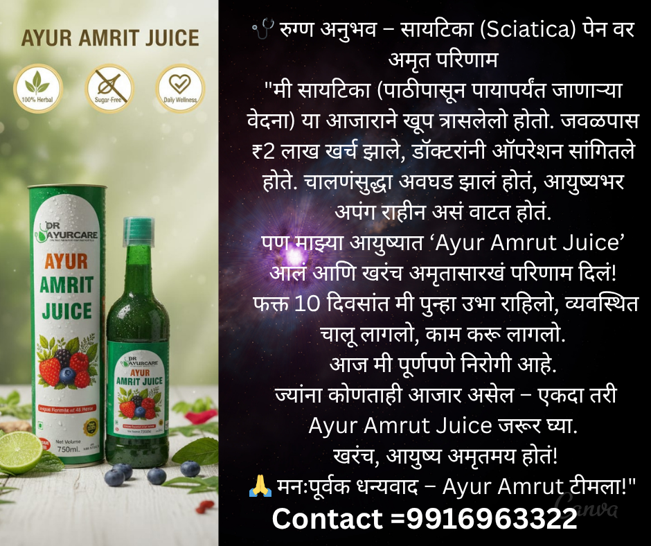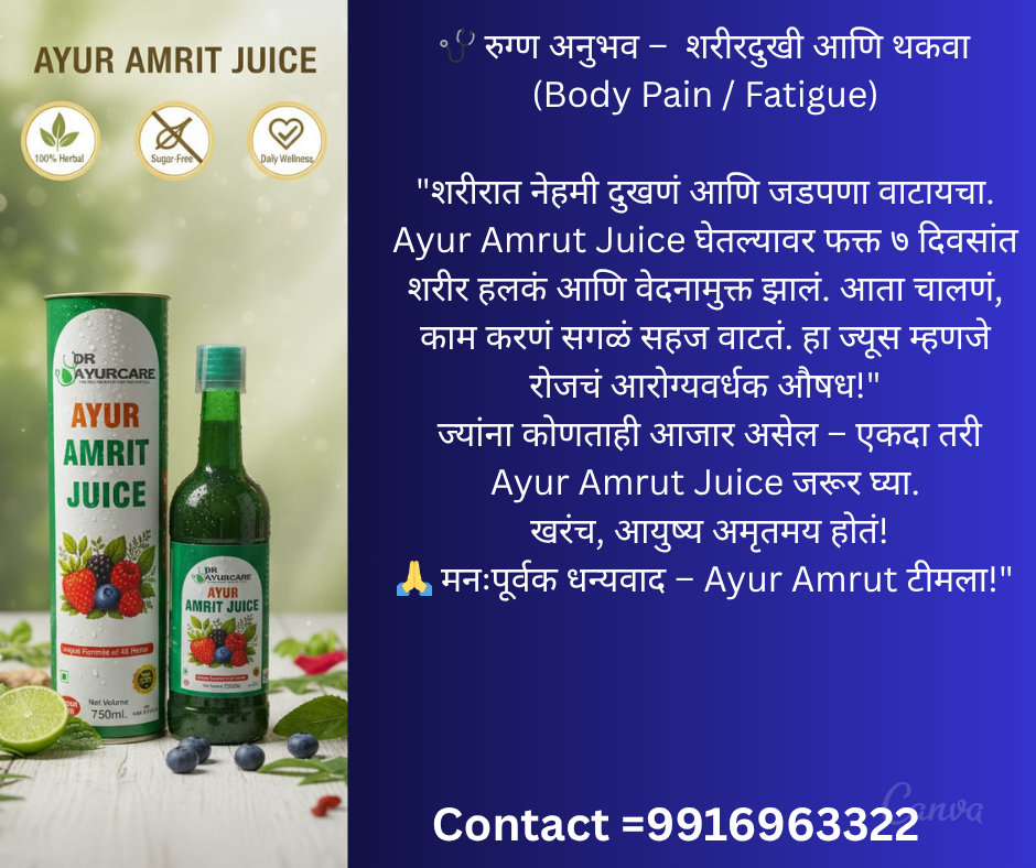 आजच्या काळात प्रत्येक घरात कुणी ना कुणी आजाराने त्रस्त असतो — कधी थकवा, कधी गॅस्ट्रिक प्रॉब्लेम, कधी शुगर, तर कधी हृदयाचे आजार. औषधं घेत घेत शरीर थकून जातं, मन उदास होतं, आणि जीवनातली ऊर्जा कमी होते. पण आता आरोग्याचा नवा मार्ग तुमच्या दारात येतोय — आयुर अमृत ज्यूस 🍃